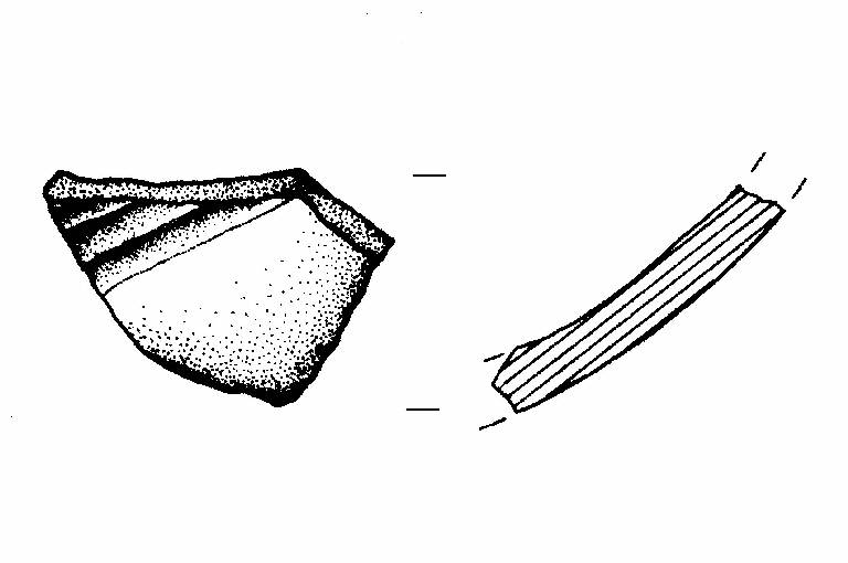Parete convessa di vasca di scodellone decorata con un fascio di larghe solcature parallele con andamento obliquo. Colore: grigio.