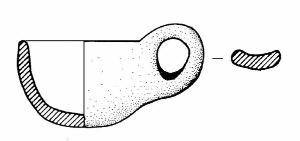 Tazzina con corpo emisferico. Orlo arrotondato. Ansa nastriforme, sopraelevata, ad anello insellata. Colore: marrone chiaro.