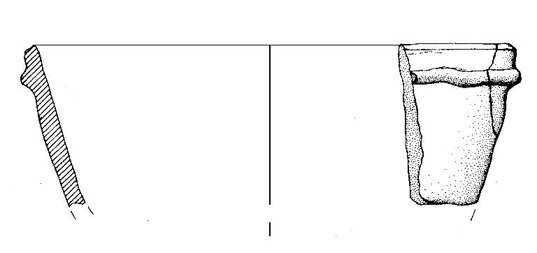 Orlo piatto obliquo verso l'esterno; parete lievemente convessa. Sulla parete, poco sotto l'orlo, cordone plastico orizzontale. Sulla parete interna tracce di incrostazioni di materiale organizo carbonizzato. Colore: grigio molto scuro.
