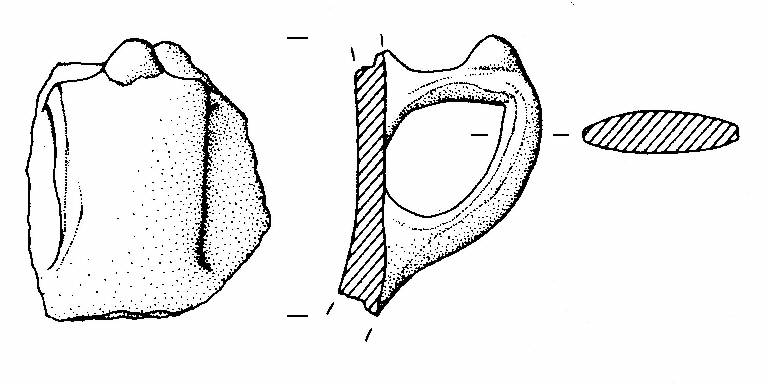 Ansa nastriforme con appendice a tubercolo e ponticello orizzontale. La superficie interna presenta incrostazioni di materiale organico. Colore: marrone.