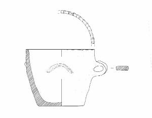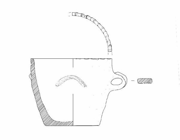 Corpo troncoconico. Orlo di forma arrotondata, decorato a impressioni digitali; parete lievemnete convessa; fondo piano. Ansa di piccole dimensioni nastriforme ad anello impostata all'altezza ci un cordone plastico di forma semicircolare applicato sulla parete. Colore: grigio-rosa.