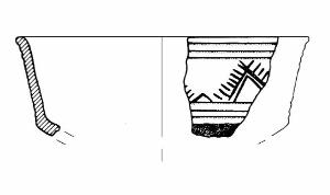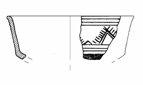 Orlo piatto; parete distinta rettilinea decorata con un motivo geometrico a incisione compreso tra due fasci di linee incise. Colore: marrone scuro.
