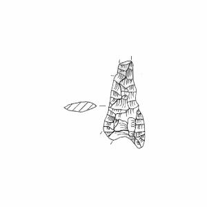 Punta foliata a base concava. Ritocco piatto, coprente, bifacciale. Margini leggermente concavi, ingrossata all'attacco delle alette. Sezione convessa. Superficie lucida. Colore oliva pallido 5Y6/4.