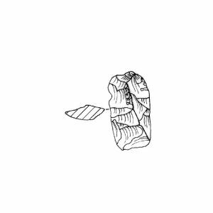 Grattatoio ritocco piatto, coprente bifacciale grossolano. Margini laterali convergenti al basso, base rettilinea, margine superiore arrotondato. Sezione covessa. Superficie lucida screziata. Colore giallo oliva 2,5Y6/8 bruno vivo 2,5YR5/8.