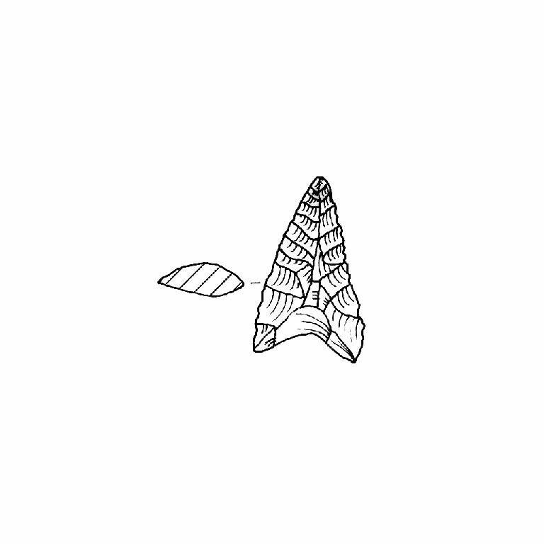 Punta foliata a base concava. Ritocco piatto, coprente, bifacciale, regolare, denticolato. Margini rettilinei, punta triangolare, alette divergenti. Sezione bombata. Superficie lucida. Colore bruno giallo 5YR5/4 bruno rosso 5YR5/3.