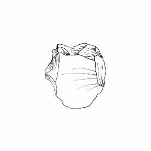 Scheggia derivante da lavorazione di nucleo. Ritocco frontale e laterale, erto, diretto. Sezione piano-convessa. Superficie lucida, faccia dorsale corticata. Colore oliva 5Y5/4; grigio oliva 5Y3/2.