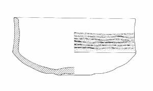 Orlo di forma arrotondata, obliquo verso l'interno; parete distinta leggermente concava, verticale; vasca a caloota; fondo concavo.\nDecorazione: sulla parete distinta fascio di sei solcature orizzontali. Colore: bruno