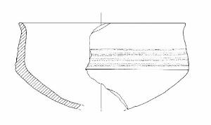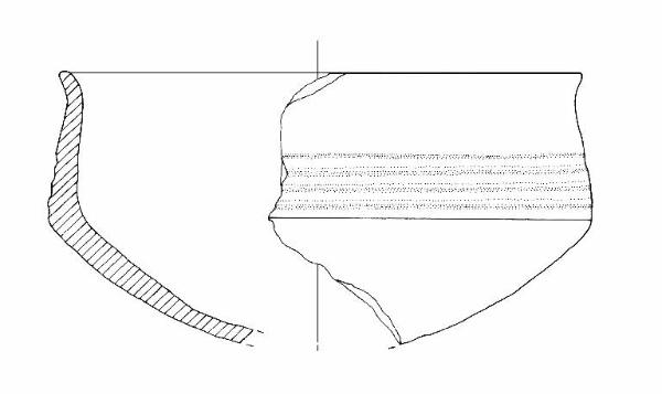 Orlo di forma arrotondata leggermente esoverso; parete distinta rettilinea rastremata verso l'orlo; vasca a calotta.\ndecorazione: fascio di quattro solcature orizzontali e parallele. Colore: bruno chiaro.