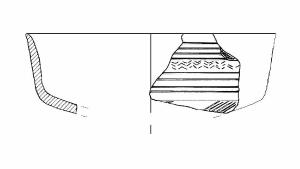 Orlo di forma arrotondata, assottigliato; parete distinta rettilinea svasata verso l'orlo; vasca troncoconica.\nDecorazione a incisione: sulla parete 2 gruggpi di 4 linee separate da un motivo a zig-zag; sulla vasca 7 linee disposte obliquamente. Colore: bruno.