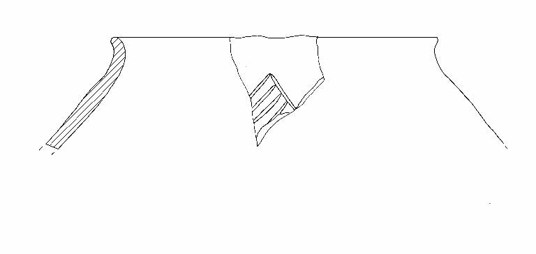 Orlo di forma arrotondata, esoverso.\nDecorazione: dente di lupo riempito a tratteggio. Colore: grigio