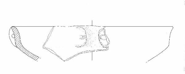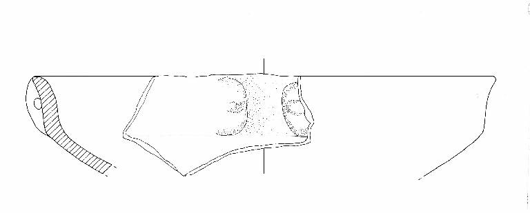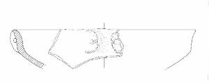 Orlo di forma arrotondata, assottigliato; parete distinta lievemente concava, svasata verso l'orlo; vasca troncoconica. Ansa canaliculata impostata in corrispondenza dell'orlo e del diametro max. Colore: bruno.