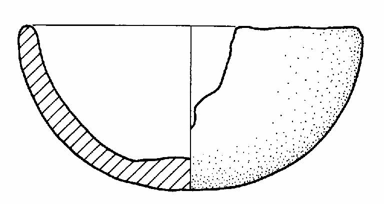 Orlo arrotondato, corpo a calotta, fondo convesso.\nImpasto a tessitura fine, di colore grigio (2,5Y6/0), inclusi puntiformi e granulosi, con frequenza scarsa e distribuzione regolare. Superficie lisciata, esterna di colore arancione (5YR6/3), interna di colore grigio-rosa (5YR6/2).