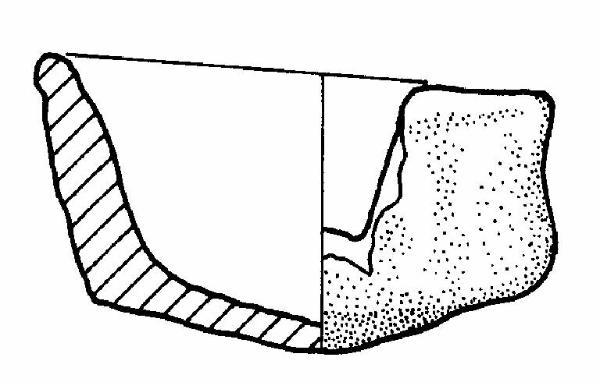 Orlo assottigliato, corpo troncoconico, fondo irregolare.\nImpasto a tessitura media, di colore grigio chiaro (7,5R8/0), inclusi puntiformi, granulosi e grossolani, con frequenza media e distribuzione irregolare. Superficie scabra, di colore grigio (2,5Y6/0).