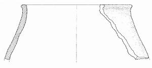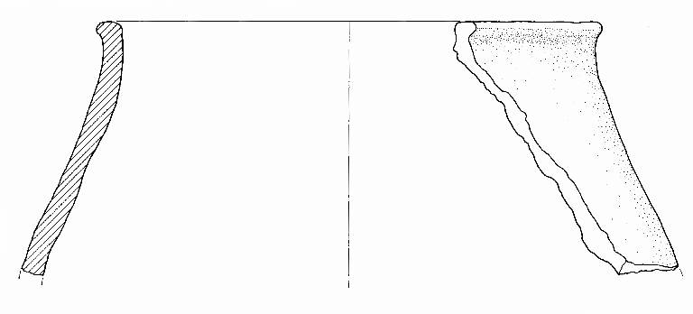 Orlo piatto ed estroflesso, corpo biconico.\nImpasto a tessitura fine, di colore grigio-rosa (10R8/2), inclusi puntiformi e granulosi, con frequenza scarsa e distribuzione regolare. Superficie lisciata, esterna di colore rosa (2,5Y5/0), interna di colore grigio-rosa (5YR7/2).