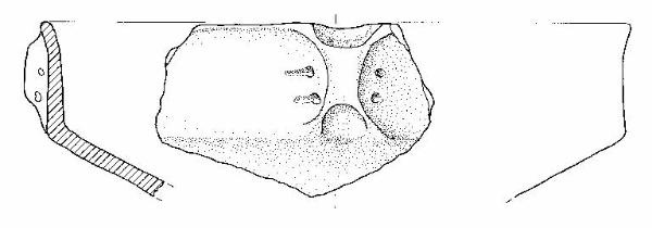 Orlo arrotondato, corpo carenato a parete leggermente concava, con Ø orlo > Ø carena, vasca troncoconica, ansa canaliculata con doppia perforazione orizzontale\nImpasto a tessitura media, di colore grigio (2,5Y6/0), inclusi puntiformi, granulosi e grossolani, con frequenza abbondante e distribuzione irregolare. Superficie lisciata e a tratti lucidata, di colore bruno-rosa chiaro (5YR6/3).