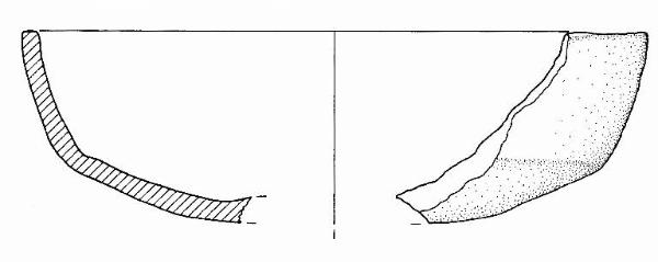 Orlo piatto, corpo carenato a parete leggermente convessa, con Ø orlo > Ø carena, vasca a calotta.\nImpasto a tessitura media, di colore grigio (7,5R5/0), inclusi puntiformi, granulosi e grossolani, con frequenza abbondante e distribuzione regolare. Superficie lisciata e a tratti lucidata, di colore grigio (2,5Y5/0).