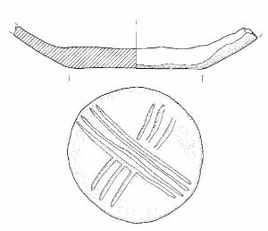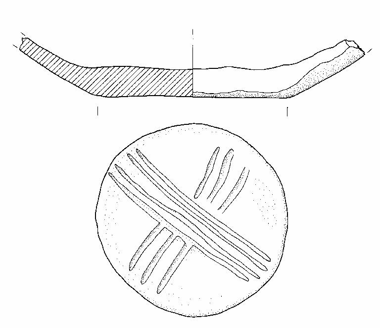 Fondo piatto, decorato esternamente da due serie di solcature tra loro perpendicolari, che delineano un motivo cruciforme.\nImpasto a tessitura grossolana, di colore grigio (7,5R5/0), inclusi puntiformi, granulosi e grossolani, con frequenza abbondante e distribuzione irregolare. Superficie esterna a tratti lisciata, di colore bruno rosa chiaro (5YR6/3) e grigio (7,5R5/0); superficie interna scabra, di colore bruno (7,5YR5/2).
