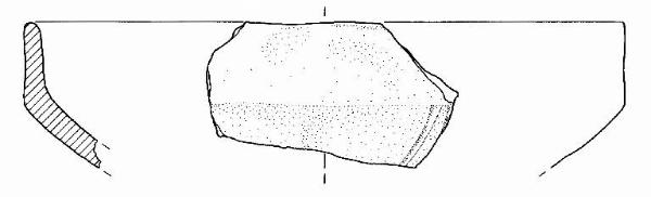 Orlo arrotondato, corpo carenato a parete rettilinea, con Ø orlo = Ø carena, vasca troncoconica, decorata da due solcature parallele.\nImpasto a tessitura media, di colore grigio chiaro (7,5R8/0), inclusi puntiformi, granulosi e grossolani, con frequenza scarsa e distribuzione irregolare. Superficie lisciata e a tratti lucidata, esterna di colore grigio scuro (7,5R4/0), interna di colore grigio (7,5R5/0).