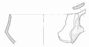 Orlo arrotondato, corpo carenato, sono visibili gli attacchi di un'ansa a nastro verticale soprelevata, impostata su orlo e carena.\nImpasto a tessitura media, di colore grigio chiaro (7,5R8/0), inclusi puntiformi e granulosi, con frequenza abbondante e distribuzione irregolare. Superficie lisciata e a tratti lucidata, di colore grigio (2,5Y5/0).\nSuperficie lisciata e a tratti lucidata, di colore grigio-rosa (5YR7/2) e grigio (7,5R7/0).
