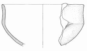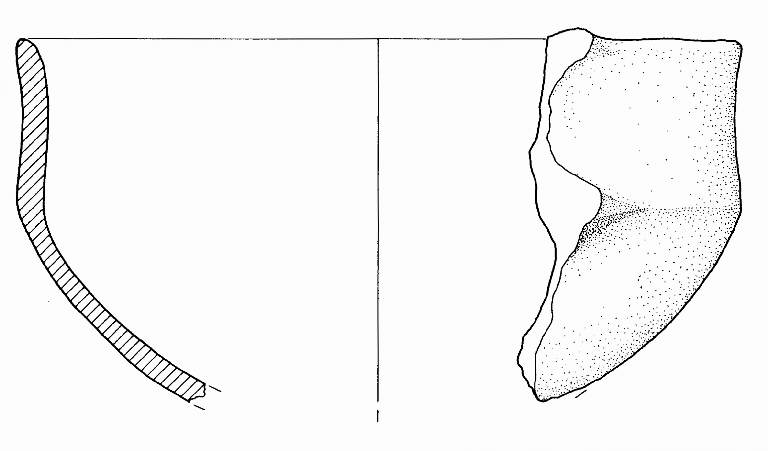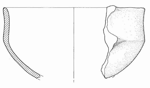 Orlo assottigliato, corpo carenato a parete leggermente concava, con Ø orlo = Ø carena, vasca a calotta. Sono visibili gli attacchi di un'ansa soprelevata, impostata su orlo e carena.\nImpasto a tessitura fine, di colore grigio (2,5Y5/0), inclusi puntiformi e granulosi, con frequenza abbondante e distribuzione regolare. Superficie lisciata e a tratti lucidata, esterna di colore grigio scuro (7,5R4/0) e bruno molto pallido (10YR7/4), interna di colore grigio (2,5Y5/0).
