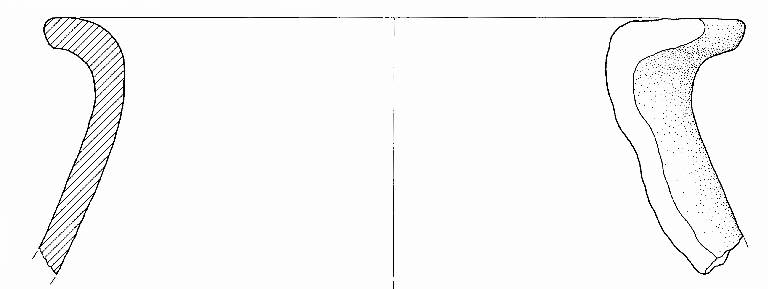Orlo a tesa, corpo biconico.\nImpasto a tessitura grossolana, di colore grigio chiaro (7,5R8/0), inclusi granulosi e grossolani, con frequenza abbondante e distribuzione irregolare. Superficie scabra, a tratti lisciata, esterna di colore rosa pallido (2,5YR6/2) e grigio (2,5Y6/0), interna di colore rosa (5YR7/4).
