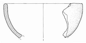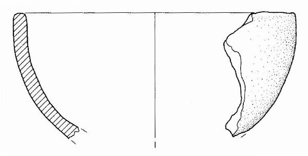 Orlo arrotondato, corpo emisferico.\nImpasto a tessitura grossolana, di colore grigio (2,5Y5/0) e arancione (7,5YR8/6), inclusi granulosi e grossolani, con frequenza abbondante e distribuzione irregolare. Superficie scabra, esterna di colore grigio (2,5Y5/0) e arancione (7,5YR8/6), interna di colore grigio (2,5Y5/0).