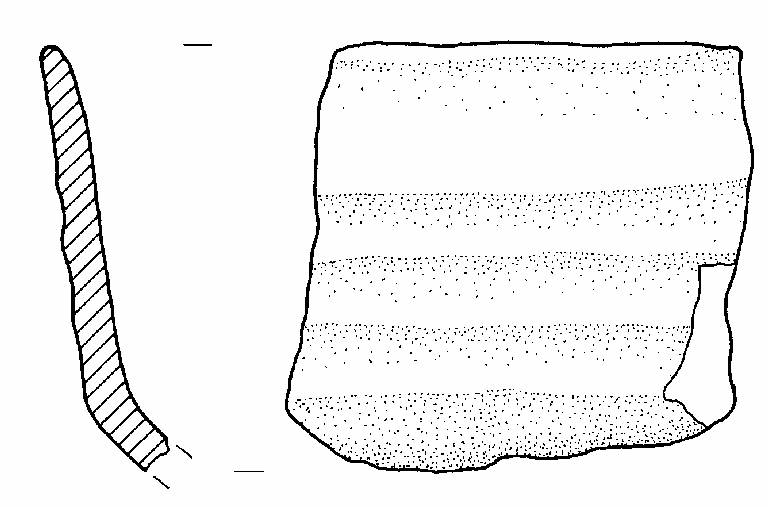 Orlo assottigliato, corpo carenato a parete rettilinea, tre scanalature orizzontali e parallele sopra la linea di carena.\nImpasto a tessitura media, di colore grigio (2,5Y5/0), inclusi puntiformi e granulosi, con frequenza abbondante e distribuzione irregolare. Superficie lisciata e a tratti lucidata, esterna di colore grigio (2,5Y5/0), interna di colore grigio scuro (2,5Y4/0).