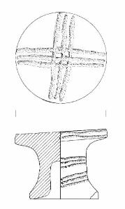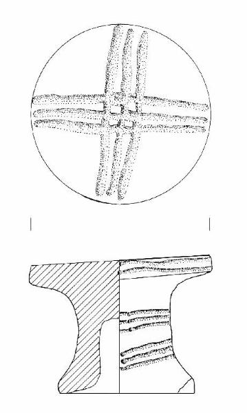 Base superiore piana poggiante su piede cavo.\nLa base è decorata da un motivo cruciforme ottenuto a solcatura. Sulla parte mediana del piede tre fasci di linee incise interrotte da una coppella.\nColore: marrone grigio molto scuro.