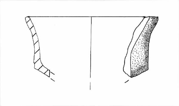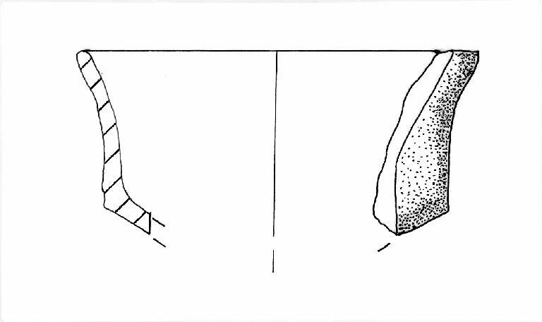 Tazza a corpo carenato con orlo arrotondato, parete a profilo sinuoso, con Ø orlo = Ø max.\nImpasto a tessitura fine, di colore grigio, inclusi puntiformi, con frequenza scarsa e distribuzione irregolare.