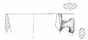 Orlo arrotondato e assottigliato. A breve distanza dall'orlo è impostata un' ansa a gomito con piccola appendice asciforme.\nImpasto con inclusi litici di piccole e medie dimensioni, di colore bruno chiaro.