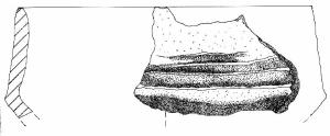 Tazza / Capeduncola carenata con orlo arrotondato, assottigliato, parete distinta rettilinea, Ø orlo = Ø max. A breve distanza dall'orlo sono impostate delle solcature orizzontali a poco pronunciate.\nImpasto a tessitura grossolana, con inclusi litici anche di grandi dimensioni di colore grigio chiaro all'esterno, rossiccia all'interno.