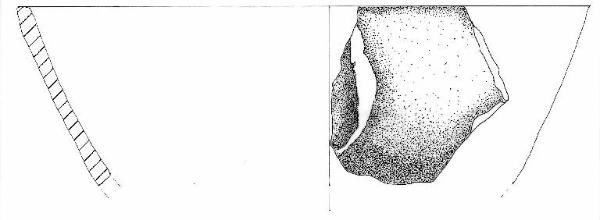 Orlo appiattito, parete a profilo rettilineo. A breve distanza dall'orlo è impostato un listello plastico che forma un motivo semicircolare.\nImpasto a tessitura grossolana con inclusi litici anche di grandi dimensioni, di colore bruno chiaro all'esterno, a tratti grigio sulla superficie interna, inclusi puntiformi.