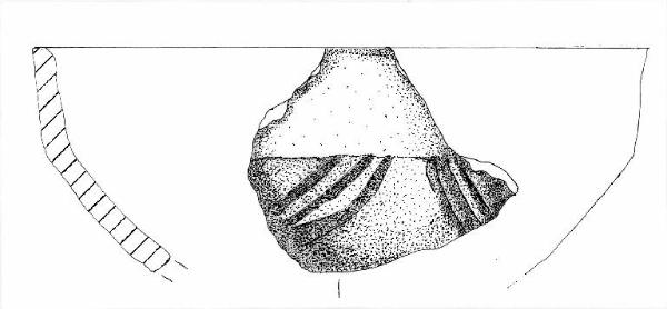Scodellone carenato con orlo appiattito, introflesso, parete distinta rettilinea, Ø orlo = Ø max, vasca a calotta. Al di sotto della carena è impostato un motivo decorativo costituito da due serie di solcature semicircolari.\nImpasto a tessitura grossolana con inclusi litici anche di medie diemnsioni, di colore bruno scuro.