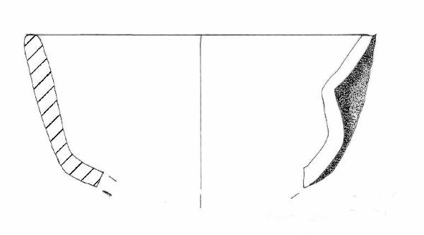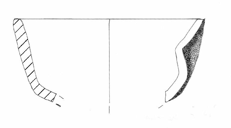 Frammento di tazza. Orlo arrotondato parete con profilo carenato. \nImpasto a tessitura grossolana, di colore marrone molto chiaro. Presenza di incrostazioni calcaree sia all'interno che all'esterno.