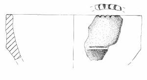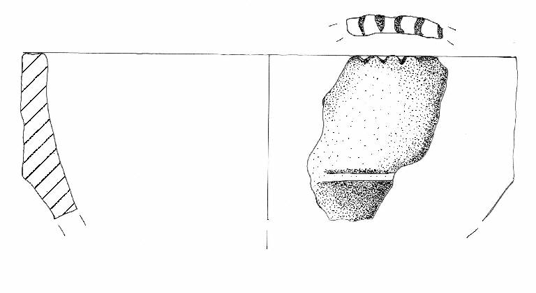Tazza / Capeduncola con orlo appiattito decorato con tacche, parete con profilo leggermente carenato su cui è impostato un cordone orizzontale.\nImpasto a tessitura grossolana con inclusi litici di medie dimensioni, di colore marrone molto chiaro. Superficie lisciata.