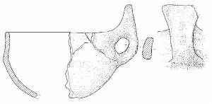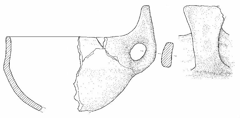 Capeduncola con orlo arrotondato, corpo carenato a parete leggermente concava, con Ø orlo < Ø carena, vasca a calotta. Ansa a nastro soprelevata, ad ascia, con margine superiore rettilineo, impostata su orlo e carena. Impasto a tessitura media, di colore grigio chiaro (7,5R8/0), inclusi granulosi e grossolani, con frequenza abbondante e distribuzione irregolare. Superficie lisciata e a tratti lucidata, di colore grigio (7,5R5/0).