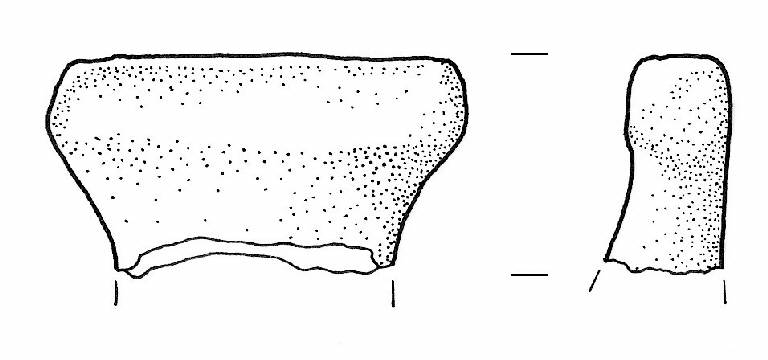 Frammento di ansa a nastro verticale, a "T", con margine superiore rettilineo.\nImpasto a tessitura fine, di colore grigio (7,5R6/0), inclusi puntiformi e granulosi, con frequenza abbondante e distribuzione irregolare. Superficie lisciata, a tratti lucidata, di colore grigio scuro (7,5R4/0).
