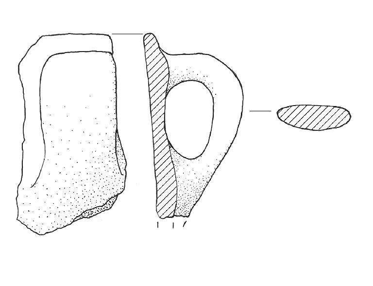 Orlo arrotondato; ansa a sezione nastriforme.\nColore: beige.