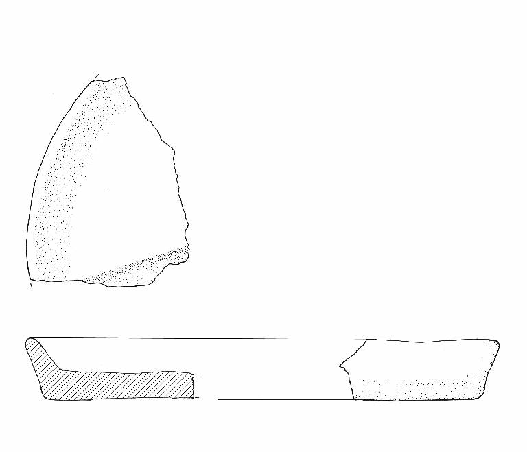 Orlo assottigliato, fondo leggermente concavo. All'interno: motivo cruciforme ottenuto a solcatura.\nColore: beige.