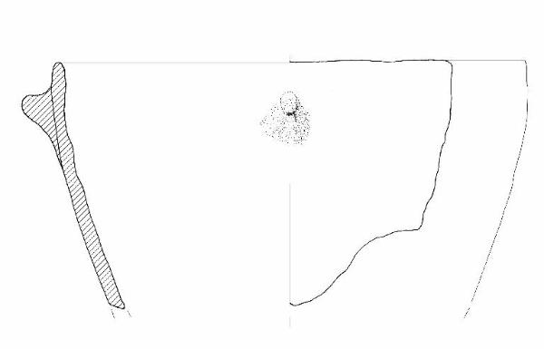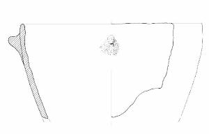 Orlo arrotondato; pareti lievemente convesse. Poco sotto l'orlo bugnetta plastica.\nColore: grigio-beige.