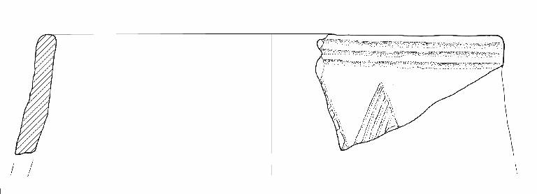 Orlo di forma arrotondata. Poco sotto line di solcature parallele e orizzontali e fila di denti di lupo.\nColore: grigio scuro.