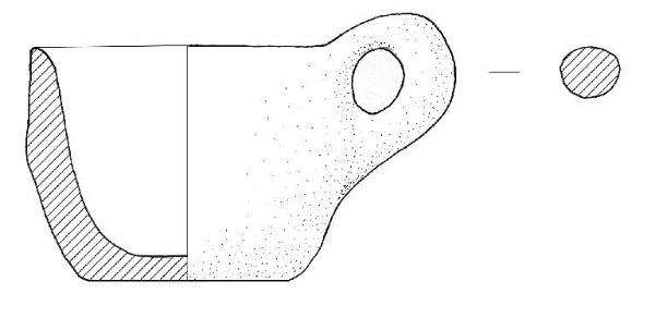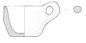 Orlo di forma arrotondata, assottigliato, fondo piano. Ansa sopraelevata ad anello.\nColore: beige.