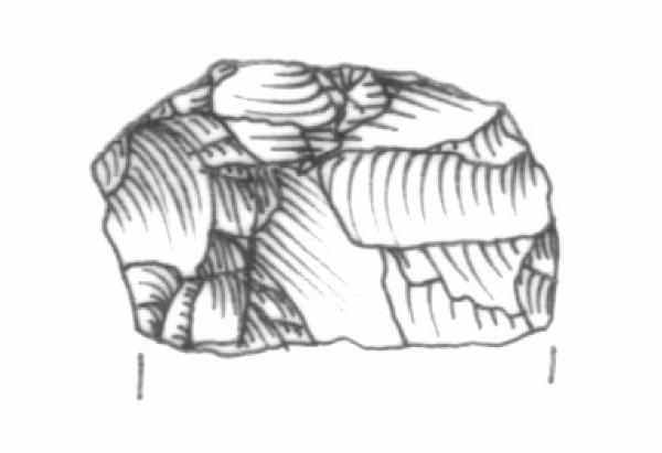 Raschiatoio foliato, ritocco coprente, bifacciale. Margine superiore convesso, margini laterali rettilinei. Sezione biconvessa. Tracce di usura lucida.
