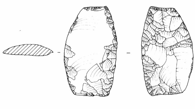 Raschiatoio foliato multiplo, ritocco invadente sulla faccia dorsale, coprente su quella ventrale. Margine inferiore rettilineo, margini laterali convessi convergenti all'alto, margine superiore leggermente concavo. Sezione piano convessa.