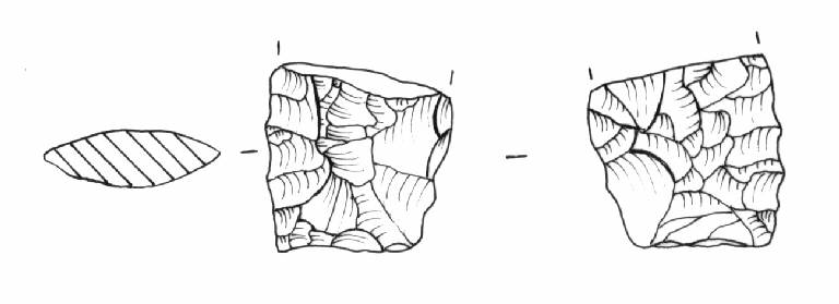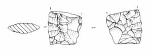 Raschiatoio foliato multiplo, ritocco coprente, bifacciale. Margine inferiore rettilineo, margini laterali rettilinei. Sezione biconvessa.