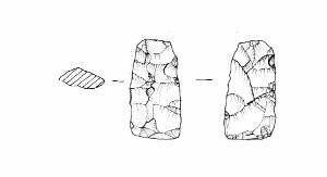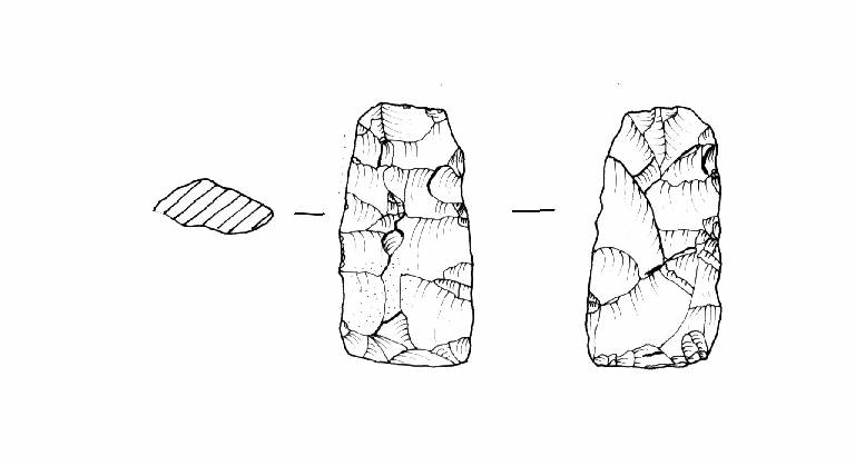 Raschiatoio foliato multiplo, ritocco coprente, bifacciale. Margine inferiore e superiore rettilinei, margini laterali covessi. Sezione irregolare.
