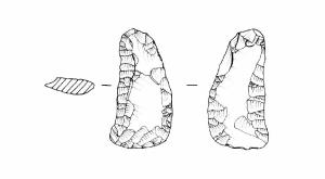 Raschiatoio foliato multiplo, ritocco invadente, bifacciale. Margine inferiore e superiore convessi, margini laterali concavo-convesso convergenti all'alto. Sezione biconvessa irregolare.