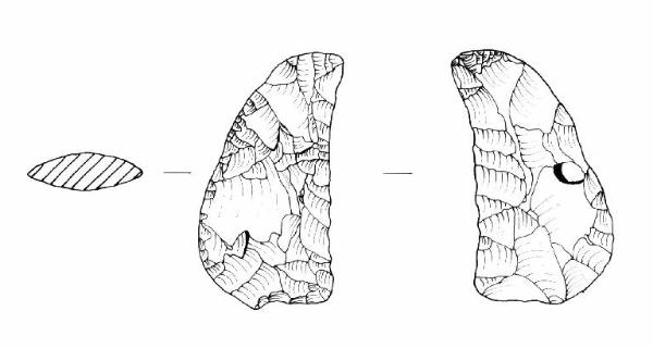 Raschiatoio foliato multiplo, ritocco coprente, bifacciale. Margine inferiore rettilineo e superiore convesso, margini laterali concavo-convessi convergenti all'alto. Sezione biconvessa.