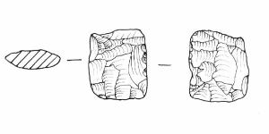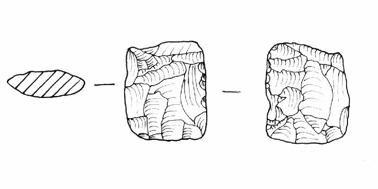 Raschiatoio foliato multiplo, ritocco coprente, bifacciale. Margini rettilinei. Sezione biconvessa.