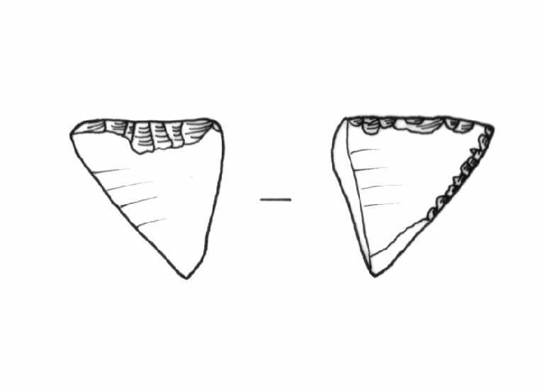 Ritocco semierto, marginale, bifacciale frontale; erto, marginale, inverso sul lato sinistro.